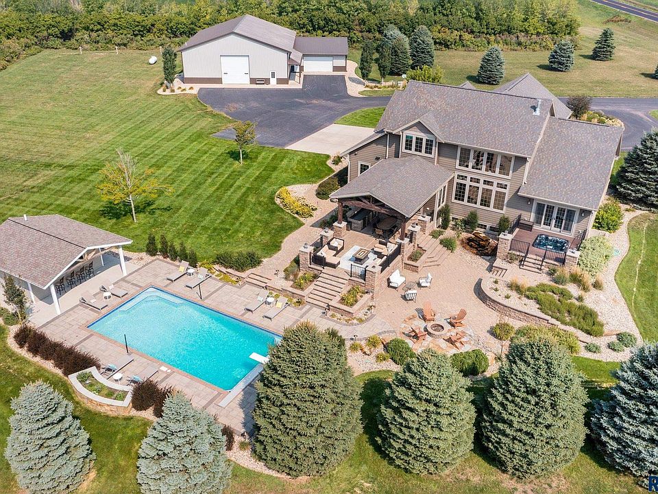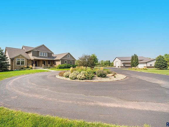Luxurious Country Living! Amazing 360 degree views! Bask in the tranquility of 5.62 landscaped acres situated near Lake Vermillion on a paved road, only 20 minutes of paved road to Sioux Falls. Host your family and friends in this 6 bedroom, 5 bath resort style home. With your stunningly beautiful heated pool, stretch summer out a bit longer. Serve guests in style at the pool house bar complete with kitchenette and bathroom. Spend cozy nights by the grand two story fireplace in the fall or snuggle in for a movie in the lower lower level theater style room. Entertain at the full bar downstairs for your next gathering. When night falls, retreat to your lavish primary suite, with walk out to hot tub. The gourmet kitchen-granite, woodwork and hidden pantry display superb craftsmanship. The property offers an additional 52x60 and 30x30 garage and shop. Huge overhead door allows the largest RV or boat, or use it as a basketball court. Geothermal utilities. So much to love here!