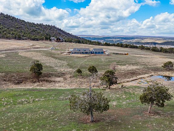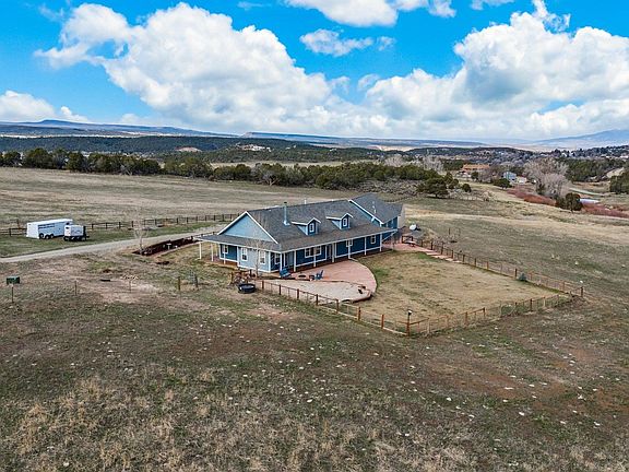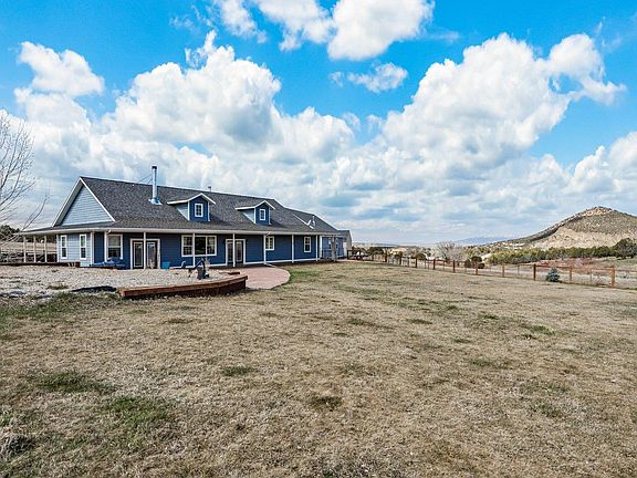 Unsurpassed beautiful mountain views! Immaculate 4 br, 3 ba ranch home on 18+/-acres. Granite countertops and beautiful custom soft closecabinets with dedicated mixer/bread machine cabinet with shelf that raises and locks without lifting appliance to counter. Stainless appliancesincluding Kitchenaid microwave/convection and 38 cubic ft Electrolux refrigerator/freezer, 3 yr old Bosch dishwasher, GE Café 6 burner rangewith pot filler. Reverse osmosis treats the Deutsch domestic water. On demand propane heater. Separate laundry/mudroom with doggie door to outside and Maytag washer and Maytag propane dryer leads to oversized 2 car garage that can be heated by propane or thermostat controlled Quadra-fire pellet stove. Open concept living/dining, rock floor to ceiling fireplace with state-of-the-art woodburning Quadra-firefireplace that will even let you know when to add wood. Wood flooring throughout with carpet in bedrooms. The 4th bedroom is currently usedas an office/studio. Primary suite has double vanity, heated jetted tub and walking dual showerheads in shower. Separate dressing/walkincloset. There is a small office room currently used for Linen storage and internet/router equipment. The media room is located above thegarage and is completed with overhead projector, screen and reclining seating. Under counter refrigerator, dishwasher and a sink add comfortfor movie night. Free standing thermostat controlled propane stove. Outside, the 18+/- acres is perimeter fenced and the yard is fenced frontand back. There is one spring fed pond and one seasonal pond that typically has water year round. The spring fed pond feeds the underground automatic sprinkler system for the lawn. Elevated vegetable/flower gardens watered by drip from sprinkler system. Redrock pavers from the Lyons Colorado quarry create a lovely patio in front and a walkway from front to back with patio and barbeque. Covered tigerwood wrap around porches. Separate firepit area in back. Extensive backyard area for croquet or other lawn games with spring perennials planted along the edges of pavers in front. Spring flowers along the fences in the east complete a beautifully landscaped exterior. There is a corral, barn/loafing shed, woodshed and storage shed with electric fencing on the southern border to protect neighbors wood rail fence.