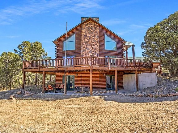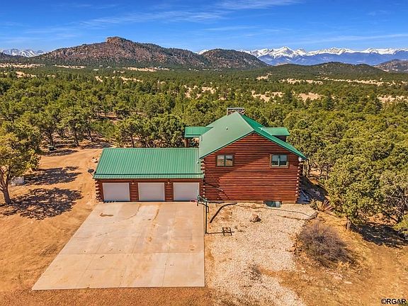 This Ranch is a secluded masterpiece located in rural Custer County not far from Westcliffe. This spacious log home can accommodate a large family with 4257 sq ft of living space including 5 large bedrooms, 3.5 bathrooms, 2 family rooms, and an office. The heart of the home (and your first impression when entering) is the monumental stone fireplace framed by multiple windows and tall vaulted ceilings that reveal the breathtaking Sangre de Cristo Mountains. This comfortable, sunny room with hardwood floors accented in mosaic tile opens to the spacious eat-in kitchen with plenty of cabinet and counter space. Two separate log staircases lead upstairs to 3 bedrooms and downstairs to the walkout basement. The heart of the home beats with a smooth rhythm. Plenty of room for your animals on the spacious fully fenced 70.81 acre property that includes a massive 40x60 Insulated Shop with high ceilings, concrete floor and 4 horse stalls in the back. The shop has a large lean to off the side for hay or equipment storage. Round Pen, Pig Pen, Dog Run, Additional Lean to. New well, new water softener, new backup generator, new hot heater, New deck and railing, and fresh stain on exterior