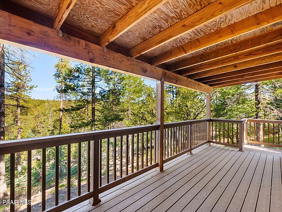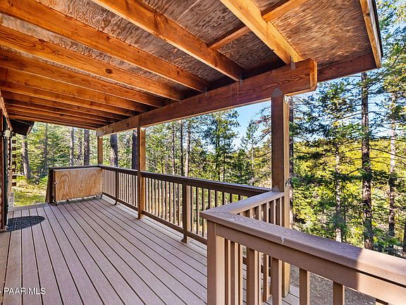 Have you been looking for your perfect getaway? New to the market this beautiful ''D-Log'' cabin nestled among the tall pines offers privacy and stunning views with just over 1 acre of useable land that backs directly to the Prescott National Forest. The covered deck area is a perfect spot to relax, take in the forest scenery and enjoy your morning coffee. Step inside to a spacious living area featuring a wood burning stove with a brick hearth. The newly remodeled kitchen with new appliances provides abundant cabinet space and a separate dining area. Two nice sized bedrooms each with closets offer ample storage, and there's one full bathroom. Below the main level, you'll find an enclosed basement ideal for a workshop or additional storage. Parking is plentiful, with both upper and lower areas providing room for multiple vehicles, UTVs, or guests. Most furnishings will convey. If you've been waiting for the right cabin at the right price, this is the one you don't want to miss! 4 WD/high clearance vehicle recommended.