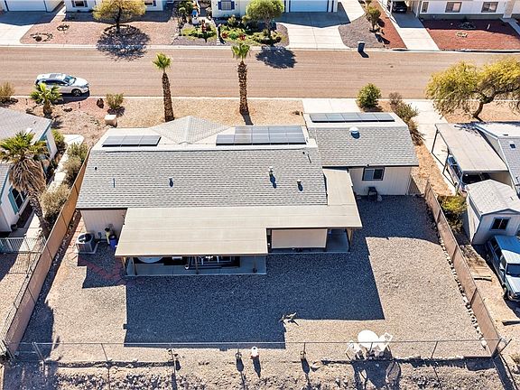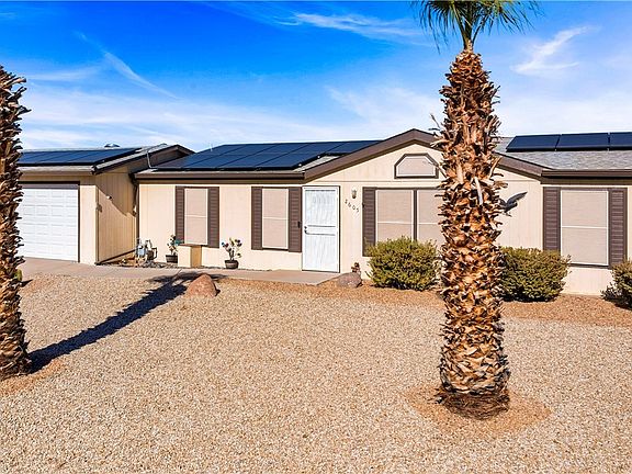 Great well maintained 3 Bedroom home with newer Solar which will be paid off at close of escow. It backs to Government land providing panoramic views of the mountains. This home offers some great features including a split floor plan. The primary Bedroom with walk-in closet at one end and the guest bedrooms at the other. The kitchen offers lots of cabinets and a casual eating area by sliding doors leading to the back patio. Makes it very convenient for BBQ. The community offers pool areas, one of which is for adults only. Play area for the kids. Great community for families or retirees. A number of new improvements within the last 2 years as follows: New AC and heater, new garage door, new front gutters, new patio door, new flooring in kitchen, living room, halls and dining area, new front door, new solar, new bathroom sinks and faucets. A short drive to the Colorado River and Laughlin, Nevada and the AVi for entertainment and dining. Medical and shopping a short distance away,