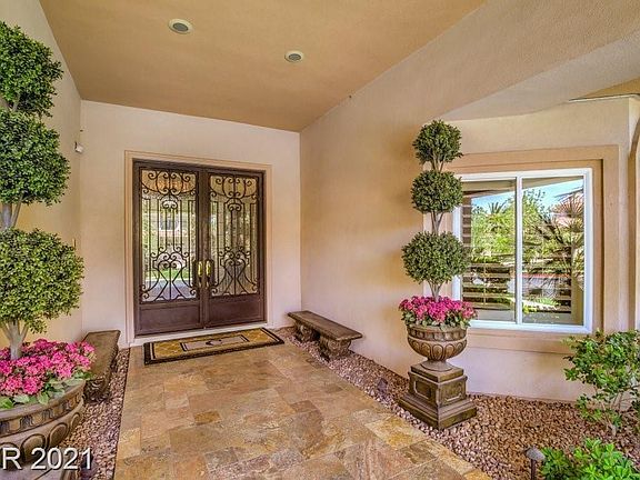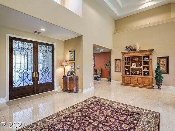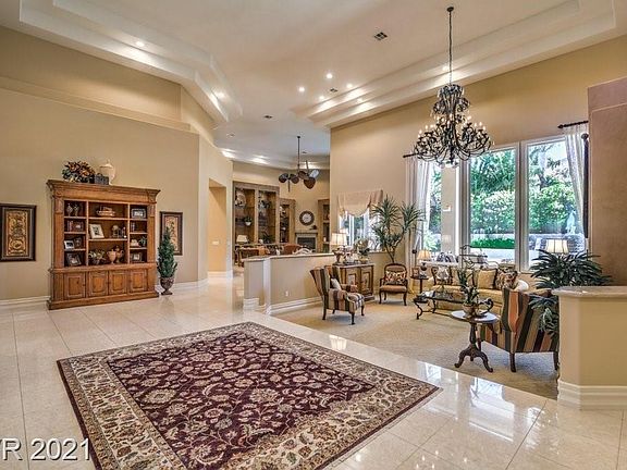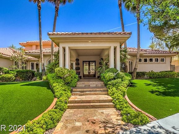 Magnificent 1 story Custom Estate in the Guard Gated Community of Terracina located in Seven Hills. Lazy cul-de-sac location with 5 bedrooms + Office + Exercise /Sitting room off Primary Bedroom & 7 baths. Dramatic entry w/soaring 26 foot ceilings overlooking a magnificent & lushly landscaped secluded oasis. Sparkling pool, spa and cascading fountain. Over a 1/2 acre lot! Work on your short game with a huge putt/chip and throw area. Seller installed $60K solar system which is paid in full. Electric bills are extremally low. Pool was taken down to dirt and rebuilt. all new plaster, all new pool equipment, all new hardscaping/deck, control box, etc. Landscaping completely re done, all synthetic grass installed, new Lynx barbeque over $103K spent. Over $10K in new window coverings, bathroom enhancements, new intercom system installed, beautiful Dacor Kitchen appliances, B.I. Full size refrigerator and Full size freezer.
