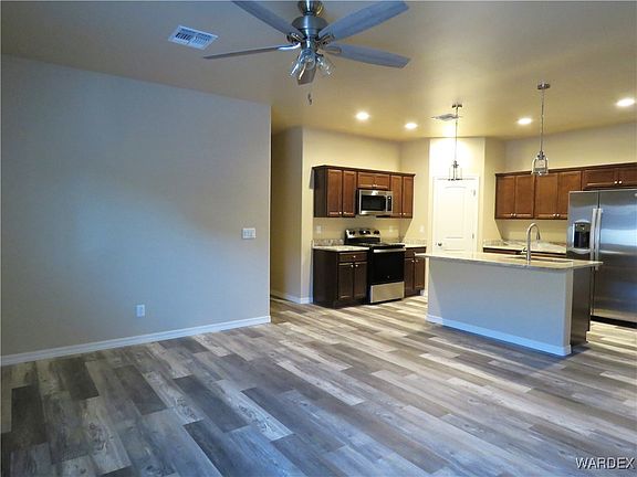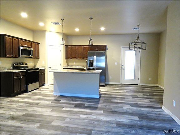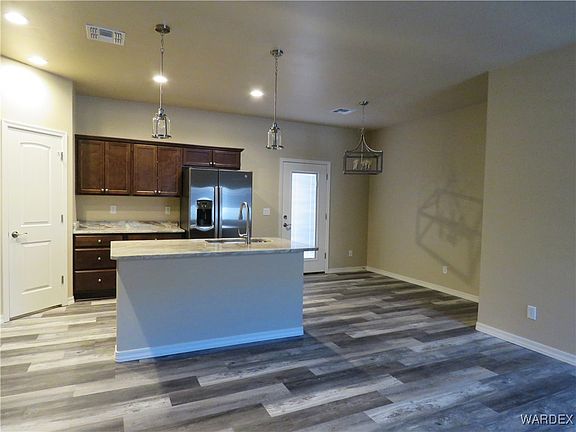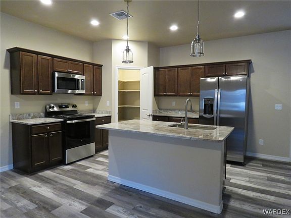 Beautiful New Construction ~ Three bedrooms, two full bathrooms, great room with living, dining & kitchen. Rich wood cabinets, granite counter tops, stainless appliances including fridge, big corner pantry, breakfast bar island with a deep single bowl sink & pending lighting. Inside laundry room with built in cabinets & closet. All electric home, 9ft ceilings, recessed lighting, ceiling fans, central heat & air, window blinds and vinyl plank flooring throughout. Attached three car garage with 8ft tall doors auto openers and rear covered patio. Fully landscaped with front drip system & RV gate. 2605 Simms Ave. Kingma, AZ