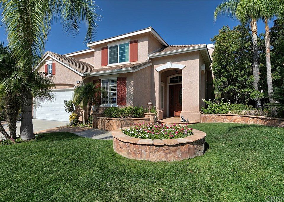 Executive POOL home located on a quiet, flat, cul-de-sac street in desirable Stevenson Ranch! With nearly 3000 sqft, this home features 5 spacious bedrooms, (one full bedroom/office/den and bathroom downstairs). Interior features include a stunning grand staircase and an open floorplan with separate formal living room and dining room with vaulted ceilings. Gourmet kitchen is complete with granite counter tops, breakfast eating area, island with breakfast bar, plenty of cabinets, trash compactor and a pantry closet. The kitchen has a slider for direct access to the backyard and opens to the extra large family room with fireplace, built-ins and lots of natural light. Outside you'll find a beautiful in-ground pool and spa, covered patio seating area, extra wide side yard with large tool shed and exquisite custom playhouse! Other highlights include wonderful curb appeal, two fireplaces, dual A/C, bedroom ceiling fans and laundry room with a sink. Prime location- easy freeway access, close to shopping, restaurants and Richard Rioux Park featuring tennis courts, baseball diamond, playground, walking trails and open fields. Also within walking distance to the award winning Stevenson Ranch Elementary School. The pride of ownership in this beautiful and well-maintained home is truly impressive! LOW HOA $30 a month.