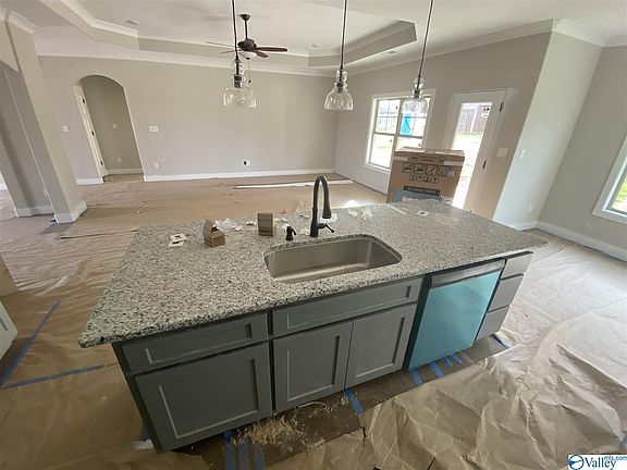 FULL BRICK OPEN FLOOR PLAN- QUALITY CUSTOM HOME. Home features 3 bedrooms, 2 baths, stack stone covered front porch & 10x20 covered rear porch gutters, down spouts, vinyl soft & wooded lot. Features include 5 inch hand scraped hardwood floors in foyer, family, kitchen, hall, powder rooms & breakfast. 9 ft smooth ceilings, barn door, ceramic tile in laundry & baths, beautiful kitchen design w/ custom cabinets featuring granite island, stainless package, & subway tile back splash. The Master boasts a tile shower, recessed can lighting. Oil Bronze Rub hardware, upgraded lighting package & plumbing package included + much more. Close to Highway 72, the interstate, Madison & more. No