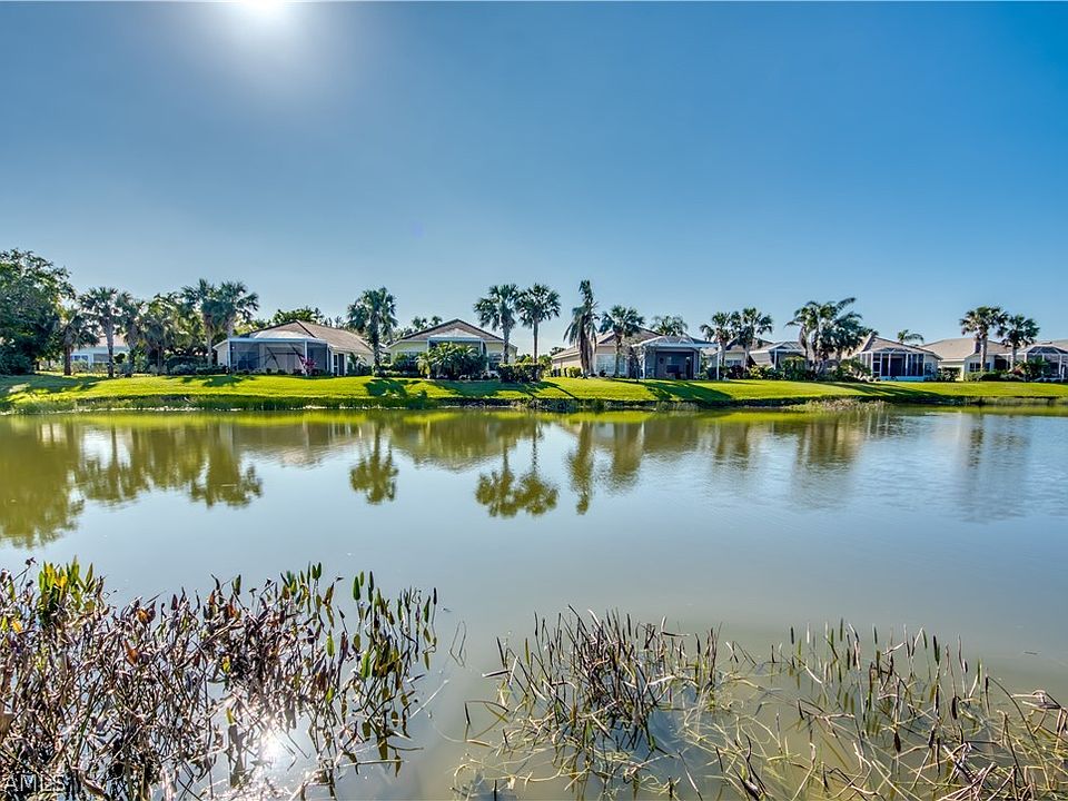 Tranquility has an address! The minute you walk in this beautiful villa you feel a natural peacefulness & serenity. Professional decor, bright, light & immaculate interior make this retreat so inviting. True maintenance free living; your HOA fees cover everything on the outside! You’ll love this lakefront & maintenance free lifestyle! Desirable greatroom style floorplan that is light, bright & full of streaming Florida sunshine. Beautiful kitchen features 42” white, raised panel cabinets with crown molding, stainless steel appliances & granite counters. Large greatroom overlooking the lake & extended pavered lanai with south exposure. Spacious master suite with windows on the water. Master bath enjoys dual sinks, walk in shower & large walk in closet. Many extras: Tile floors, Tile roof, 8’ sliders, Kevlar electric hurricane shutters on extended lanai, manual shutters elsewhere. HOA $449/mo includes roof, exterior paint & maintenance, lawncare, trimming & WIFI. Sandoval is Cape Coral's top destination! Enjoy the ward-winning lagoon pool, water slide, splash area, fitness center, volleyball, pickleball, tennis, basketball, bocce, fishing pier, parks & more! Easy walk to amenities.