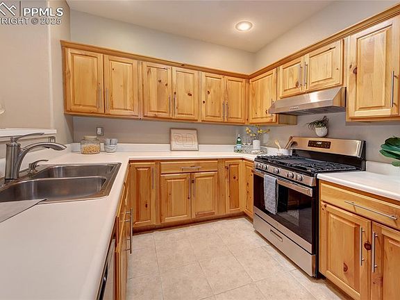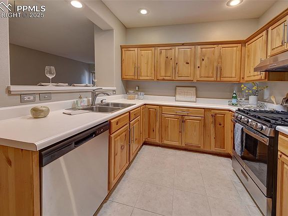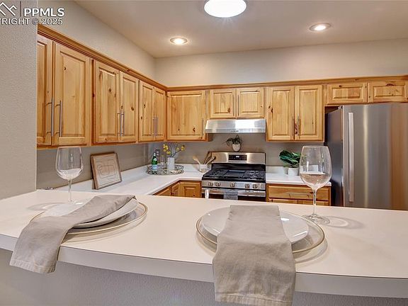 This charming southwest-style Briargate home offers convenient main-level living with an attached two-car garage. On the main floor, you'll find the primary bedroom with its own bath and a spacious living room with a gas fireplace. The living room has access to a large deck with mountain views. There's also a dining area, breakfast bar, half bath, and a well-appointed kitchen complete with a new gas stove with steam & griddle, a new microwave, and plenty of pantry space. Both the main level and basement boast 9-foot ceilings. Downstairs, a walk-out basement leads to a concrete patio that overlooks a peaceful greenspace area. additional highlights include two large bedrooms, a full bath, a generous storage room, and convenient laundry facilities with a washer and dryer included. This home features several recent upgrades, including central air conditioning, updated faucets, thermostat, and a new roof installed in 2022. Ideally situated near shopping, dining, walking trails, parks, and hospitals, with easy access to i-25 for commuters. Recent additions to the kitchen include anew stainless steel refrigerator, dishwasher, and gas stove installed in December 2023