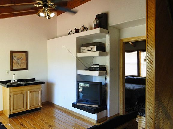 Enjoy the openness of the soaring wood beamed ceilings and loft area above with wood flooring, wetbar, built-in entertainment area and great views from the balcony over-looking the back yard. Home features 2 large decks, free standing cast iron fireplace, Hickory cabinets in the kitchen & bath, dining area is a light & bright bay window where you can enjoy the views of the beautiful outdoors, central vacuum system, laundryroom w/overhead cabinets. (Furniture & household items convey gratis outside of escrow)Owner is licensed Realtor in AZ.