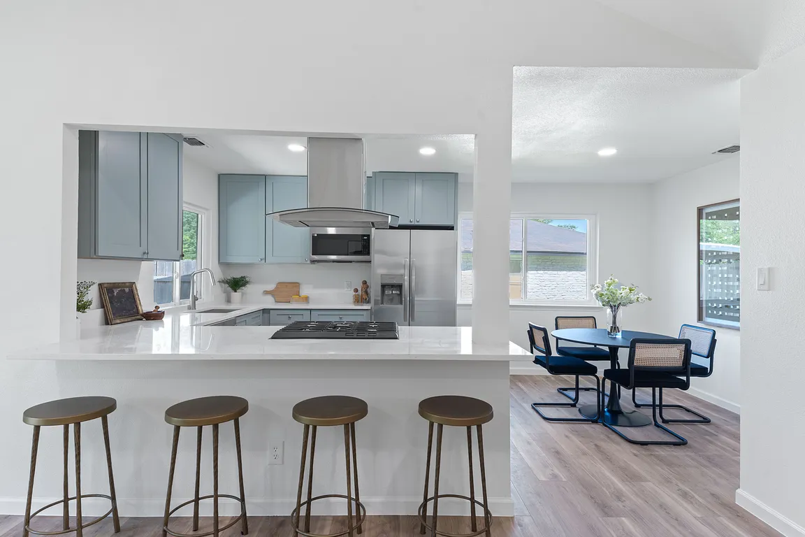 - Features: Breakfast Bar, Quartz Counters, Dining Area, Open to Family Room, Recessed Lighting