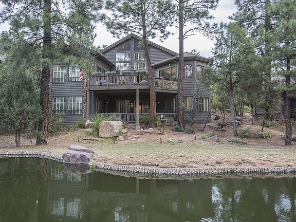 THIS IDYLLIC SETTING IS PERFECT FOR YOUR MOUNTAIN HOME ? located on the water with golf course views in the Chaparral Pines golf community! Fall asleep to the sound of the waterfall and the whisper of the wind through the massive Ponderosa Pines which are a cool shroud for the home. This four bedroom/four bath home is perfect for just you, or to host family and friends alike with the spacious living areas, both upstairs and downstairs, and a split floorplan for the four bedrooms, each with en suite bath. The floor to ceiling windows bring the outside in so you can enjoy the fabulous views to the ponds and golf course and wonderful light filtered through the pines. Also, an extensive deck space gives you ample opportunity to entertain and enjoy the clean mountain air. The kitchen offers plenty of space to entertain and is a chef's delight with double ovens, gas stovetop with griddle, new refrigerator/freezer and two new dishwashers. An opportunity in this location is rare, take advantage of it now!