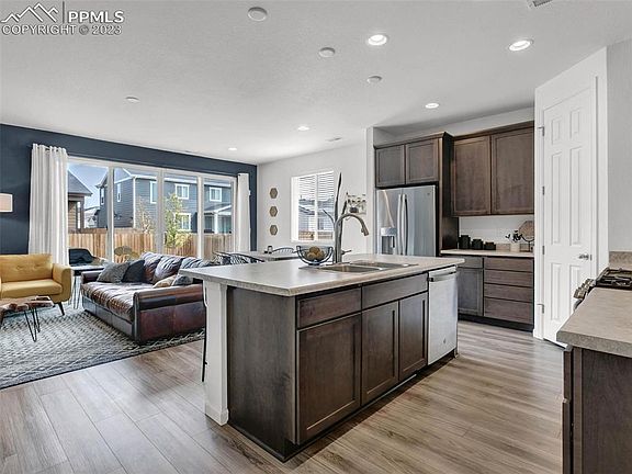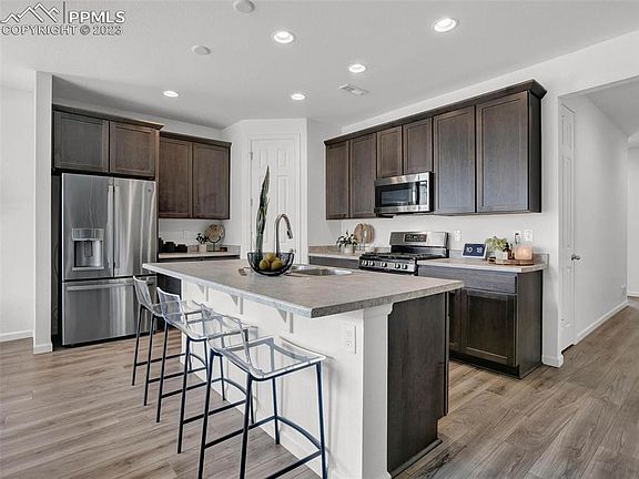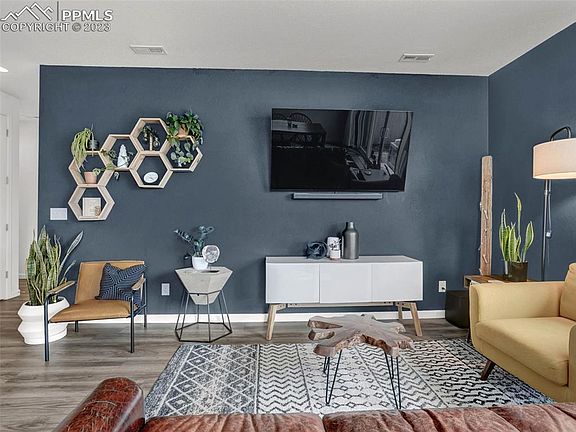 This charming ranch style home offers three bedrooms, two baths and a two-car garage. You are greeted with stylish luxury vinyl plank flooring that extends throughout most of the main level. The kitchen offers a 5-burner gas range, built in microwave, dishwasher, included refrigerator and a walk-in pantry offering unsparing storage space. The open floor plan is perfect for entertaining or enjoying time with loved ones after a long day at work. The Primary suite offers its own private bath with walk in shower, double vanity and a generous sized walk-in closet. A full bath is shared by the secondary bedrooms and the convenient laundry room with included washer & dryer complete the main level. Enjoy backyard BBQs from your rear patio. The backyard is fully fenced which will be perfect for your furry friends to run around. Central Air conditioning will be welcomed during the upcoming hot summer months. Ultra-modern paint accents, pre-wired for pendant lighting at the kitchen island, walk in pantry, South facing driveway that you'll love in the winter months, Cul-de-sac location, walking trails throughout the neighborhood, nearby restaurants, shopping, banking and a short drive to Peterson SFB, Schreiver SFB and Fort Carson. Hurry, this one won’t last long! Come see it today and make it yours!