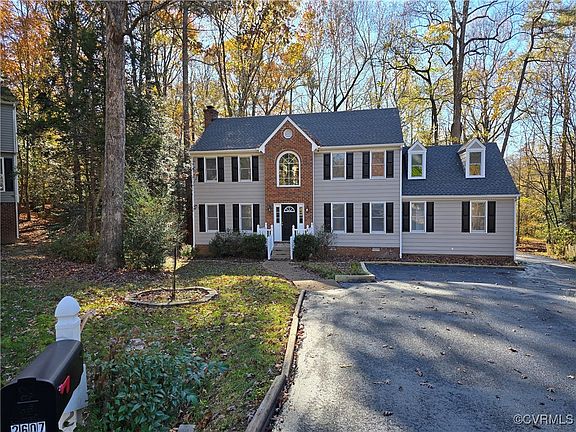 You are going to LOVE this beautiful 2-story transitional on 2.55 acres in North Chesterfield county. Live your best life nestled in a quiet cul-de-sac on a private wooded lot. Arrive home to your dramatic sunlit 2-story foyer with elegant chandelier. To your left is a bright and airy great room with cozy fireplace, boasting unhindered views of the multitiered deck and backyard. Step into the HEART OF YOUR HOME to find a STUNNING and thoughtfully updated kitchen with beautiful cabinetry & crown molding, quartz countertops, tile backsplash, under cabinet lighting, SS appliances, pantry cabinet & pantry closet for plenty of storage options. See yourself relaxing at the kitchen table, overlooking the rear wooded yard through your attractive bay window. The dining room with chair rail, crown & sconce lights are ready for family gatherings. A dedicated laundry room and 1/2 bathroom are just off of the kitchen with easy access to the clean & freshly painted garage with a custom bonus storage area. This home also features extensive parking with front and rear paved areas. Stroll upstairs to find four well proportioned bedrooms, all with new hardware & flooring. The primary bedroom features a fully updated en-suite with walk-in shower/glass door and separate sink area with a large walk-in closet. Other features & updates include: NEW Roof, NEW 2-zone HVAC systems, NEW LVP in Great Room, Kitchen, Laundry & 1st floor bathroom, refinished hardwoods in Foyer & D.R., freshly painted interior/exterior, NEW carpet upstairs, NEW LVP in 2nd floor baths, resealed driveway, NEW garage door with opener and so much more. Don't miss this opportunity to settle in and stay awhile!