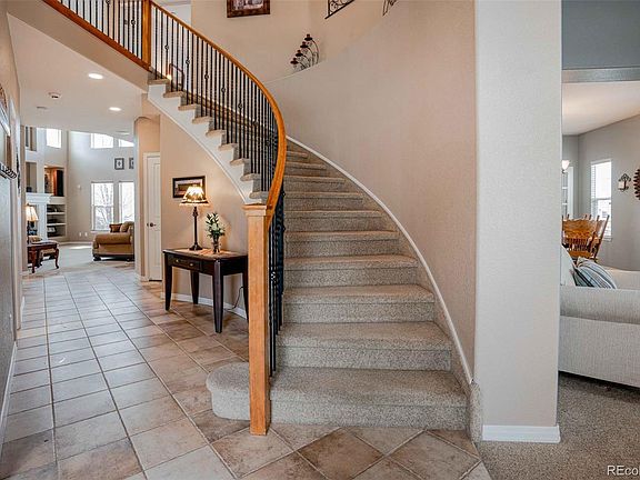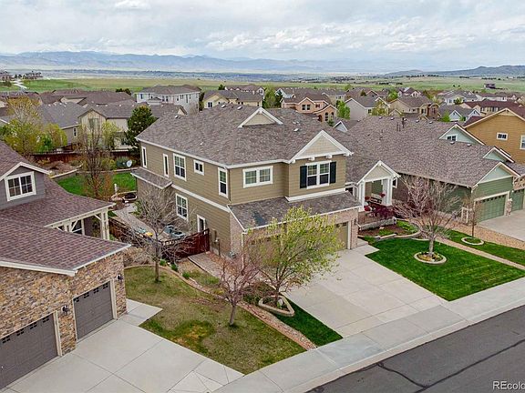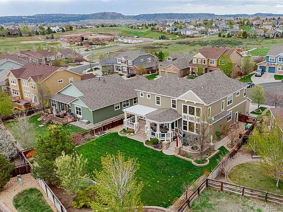 Experience indoor-outdoor space at its finest! Beautiful two-story in The Meadows featuring fabulous mountain views, an incredibly landscaped backyard that backs to open space, and ample space to spread out with five bedrooms! Beyond the grand foyer, the stately living room opens to the formal dining room, perfect for entertaining. A chef's dream, the spacious kitchen showcases upgraded cabinetry, stainless steel appliances including a double oven, an island with a cooktop, and a casual dining area with access to the gorgeous outside space. The exquisitely landscaped backyard is an outdoor oasis, featuring an expansive covered deck, patio with a firepit, vibrant yard, and superb mountain views. Spend time in the family room with soaring ceilings, fireplace, built-ins, and abundant windows. Also on the main, find the charming sunroom, ideal for relaxing and taking in the beautiful Colorado scenery. A well-sized executive office, half bathroom, and laundry room round out the main level. Upstairs, the master suite is appointed with a five-piece en suite bathroom and walk-in closet. A second bedroom boasts an en suite bathroom, and a third and fourth bedroom share a full bathroom. In the vast basement, find a recreation room complete with a stylish wet bar and dining space! A fifth fully conforming bedroom and three-quarter bathroom complete the lower level. Park with ease in the three-car garage. Resting on a cul-de-sac, this home is ideally located near the neighborhood playground, several hiking trails, Red Hawk Ridge Golf Course, and community schools. Don't miss out on this extraordinary find!