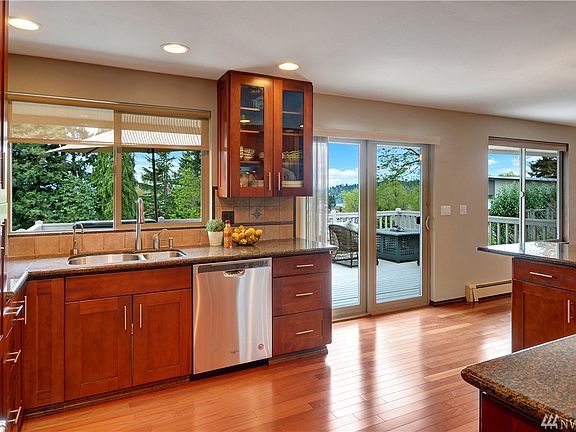 Uplifting LK Wash & Olympic Mnt views from this private Lwr Kennydale gem, solidly built and well cared for. Sited on a spacious .40 ac lot it affords plenty of parking & expandability.Daylight rambler with roomy main floor master. Richly updated kitchen adorned with granite counters, Viking frig, and cherry cabinetry. Hydronic radiant base heaters, office, sauna & rec-room are a bonus. Enjoy the expansive & sunny view deck and large lawn area to garden & play. Quick access to 405 & The Landing.