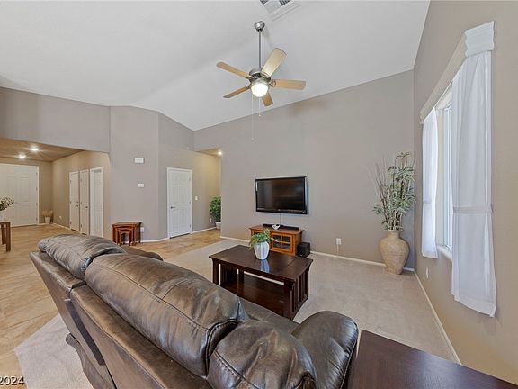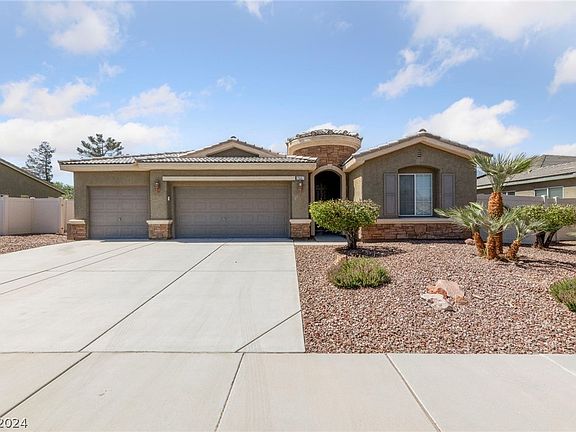 Welcome to your new home in the beautiful community of Pleasant Valley in Pahrump, Nevada! This charming single-story residence offers 1,587 square feet of comfortable living space, featuring 3 spacious bedrooms and 2 well-appointed bathrooms. The living area seamlessly flows into the dining space and kitchen, creating a warm and welcoming atmosphere. The kitchen boasts ample cabinetry, and a convenient breakfast bar. The primary suite provides a serene retreat with an en-suite bathroom and plenty of closet space. Two additional bedrooms are perfect for family, guests, or a home office. Outside, you'll find a generous 3-car garage providing ample storage and parking. The backyard has a covered patio, ideal for relaxing or hosting gatherings, and features low-maintenance desert landscaping. The community has a variety of amenities. Enjoy the park, complete with a basketball court, covered picnic area, and a large grass field, perfect for outdoor activities and family fun.