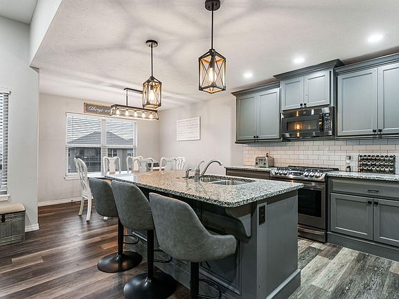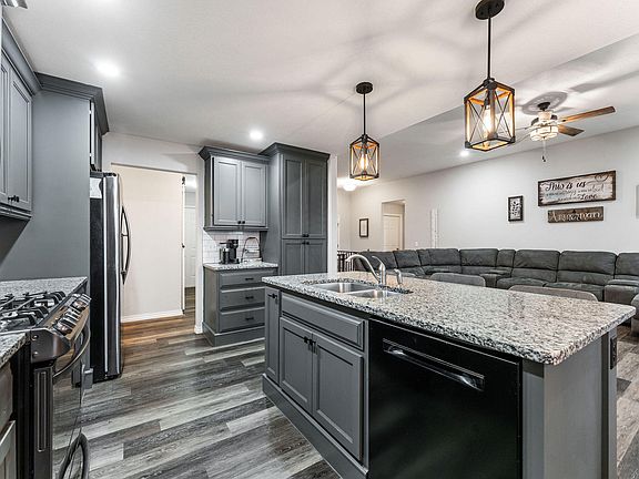 Nestled in the highly sought-after Stone Gate subdivision, this stunning 5-bedroom, 3-bathroom home with a walkout basement is meticulously crafted and ready for its new owners. As you step inside, the living room instantly captures your attention with an abundance of natural light pouring through the expansive windows. The open concept design seamlessly blends the living space with a gourmet kitchen, featuring updated soft-close cabinets, modern fixtures, stainless steel appliances including a newer gas stove, refrigerator, microwave, and dishwasher. The granite countertops and generously sized island make this kitchen perfect for both entertaining and culinary adventures. Adjacent to the kitchen is a spacious dining area, ideal for social gatherings. On the main level, you'll find a tranquil primary suite with tray ceilings, a roomy walk-in closet, and an elegant primary bathroom with dual vanities and a beautifully tiled walk-in shower. Additionally, the main level offers two more spacious bedrooms, a full bath, and an oversized pantry that will surely impress, all covered by a chic barn sliding door. The basement presents a secondary living area, two additional bedrooms, a full bathroom, and a massive storage space, currently being used as a gym. Complete with a full-size laundry room featuring top-of-the-line washer and gas dryer included. Outside, two covered decks overlook the privacy fenced yard, creating a charming outdoor oasis. Other notable amenities include a built-in coat hanger/bench, a 3-car garage with ample storage, and the inclusion of a Freedom Safe. Enjoy the convenience of the large backyard with privacy fencing, providing additional space for yard item storage. This exceptional property also boasts a pellet-free water softener, a 4-zoned lawn sprinkler system, new paint, new luxury vinyl flooring, and a scented aroma HVAC machine. ++NEW LOWER LEVEL FLOORING INSTALLED AUG 2024!