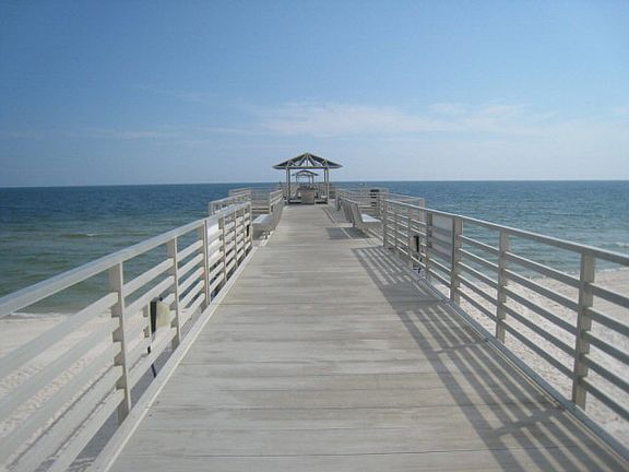 Fish off the private 702' pier year round with shade & seating or just enjoy the view of the fish swimming under you! The pier is easily accessible & provides shade underneath. Swim in the beach-side outdoor pool or the heated indoor pool with a gulf view. Amenities include fitness center,charcoal grills & more. The entrance is guarded by security who does not allow disruptive guest behavior! There is a Direct Gulf View from the living room & master bedroom. Balcony is accessible by large sliding glass doors from the living room, master bedroom & King guest room which has a private bath, too! The spacious master bedroom privately adjoins the master bath with a double sink vanity, shower & large jetted tub. Queen guest adjoins hall bath. New tile,kitchen cabinets, granite, stainless appliances were recently installed. It has a strong rental history. Buyer's agent to verify measurements/information. All furnishings convey.