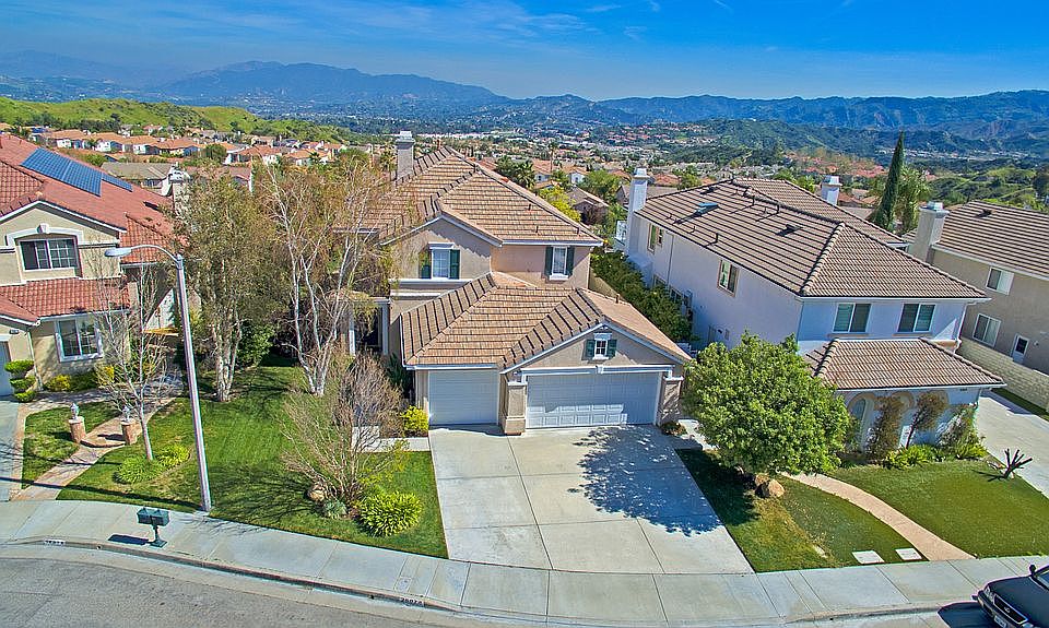 LOCATION, LOCATION, LOCATION!!!! Amazing Stevenson Ranch panoramic view home located towards the end of the cul-de-sac in the Ryland Summit neighborhood. Original owners selling this home exuding pride of ownership, boasting crown molding, large baseboards, vaulted ceilings, neutral decor, recessed lighting, double fireplace, and shows light and bright throughout. The kitchen opens to the family room and has been remodeled with center island that includes breakfast bar, quartz counters w/ custom backsplash, white cabinetry, and views of the valley. Downstairs there is a full bath. Downstairs your own private custom Irish Pub for entertaining. Upstairs there is another full bath and two bedrooms. In addition enjoy your master suite with high ceilings, second fireplace, private balcony to see breathtaking views of Santa Clarita Valley. The en suite private master bath has large walk in closet, his & her separate sinks, private water closet, soaking tub w/ separate shower to relax and enjoy your stunning views. You'll love entertaining in your amazing backyard with covered patio, lush landscaping, sparkling pool, spa w/ water feature, and majestic views of the Valley, Mountains, and city lights! This home is a must see!