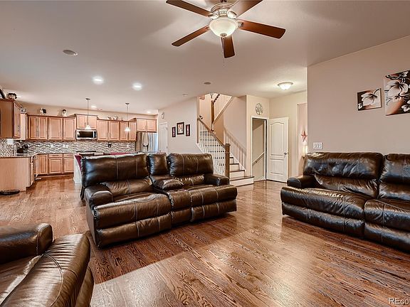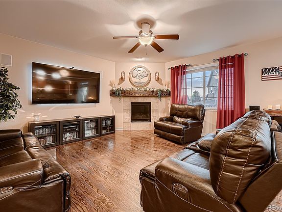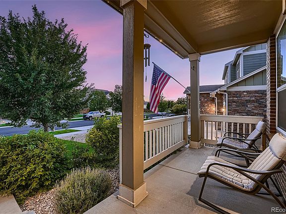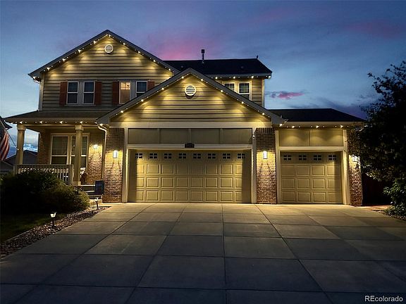 Welcome to this immaculate 4-bedroom, 5-bathroom home in the desirable Adonea neighborhood. This luxurious residence offers a perfect layout for comfortable living. The beautifully landscaped front yard and inviting porch set a serene tone, enhanced by custom Gemstone lighting that creates an elegant ambiance and adds security at night. Inside, the main level features gleaming hardwood floors throughout the open floor plan. A welcoming home office and a convenient half bathroom greet you at the entrance. The great room includes a cozy gas fireplace and surround sound, perfect for relaxation and entertainment. The adjacent dining room and kitchen boast granite countertops, a spacious island with bar seating, stainless steel appliances, and a pantry, ideal for daily living and entertaining. A laundry room off the kitchen enhances the home's practical design. The upper level offers four generous bedrooms, each with a ceiling fan for added comfort. The primary suite includes a large walk-in closet and a luxurious five-piece bathroom. The second bedroom has its own private full bathroom, while bedrooms three and four share a Jack and Jill full bath, making the home ideal for accommodating multiple occupants. The finished basement provides versatile space, featuring a large open area, a 3/4 bath, a wet bar, and a utility room with ample storage. This area is perfect for a game room, home gym, additional living room, or guest accommodations. Outside, the oversized stamped concrete patio is ideal for outdoor dining and relaxing. The home also includes a spacious three-car garage, offering ample parking and storage. Conveniently located near I-70 and E-470, it's just 20 minutes from Denver International Airport and 15 minutes from Buckley Space Force Base. Community amenities include a pool, park, playground, and basketball courts, providing various recreational options. This home blends luxury, comfort, and functionality—don't miss the opportunity to make it yours!