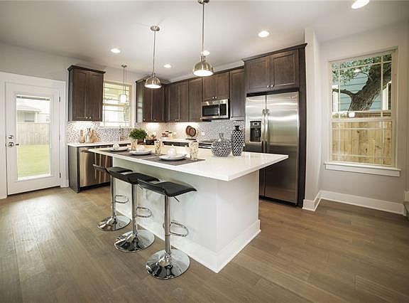 Phenomenal custom build just min from DT in private S Austin Autumn Wood community. Spacious open floor plan w/ wood-like tile floors, vaulted ceilings + tons of natural light! Eco-friendly living including roof-top solar array, hybrid heat pump water heater, variable speed HVAC, LED lighting means affordable utilities! Stunning features like induction cooktop, stainless steel apps, quartz counters, soft-close drawers + wiring for surround sound!