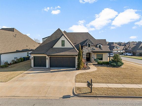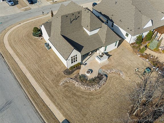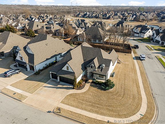 This gorgeous custom build is a must see! Primary suite + 2nd suite + Office +formal dining down. 2 bedrooms + pullman bath +powder bath+ massive game room up. Kitchen has extended nook area, double ovens, commercial fridge, dry bar with wine fridge and oversized island. Covered patio with extended concrete, outdoor kitchen and bar area. Outdoor firepit + backyard landscaping. Solar board Roof Decking. Safe room. Full gutters & full sprinkler system included. Pre-wired for surround sound and includes central vac system. Neighborhood Pool with Cabana. Ponds for catch & release fishing. One mile from Bixby West.