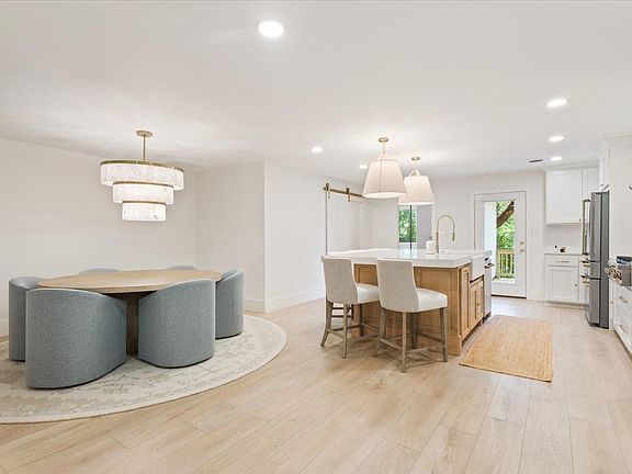 Inside, the open living area features wide plank vinyl laminate flooring, expansive windows, and a contemporary cast-stone fireplace. A dedicated dining area flows seamlessly into the gourmet kitchen outfitted with ZLINE pro appliances, including a double oven, six-burner gas cooktop and pot filler. An adjacent butler’s pantry equipped with a beverage and wine fridge, microwave, and space for countertop appliances.
