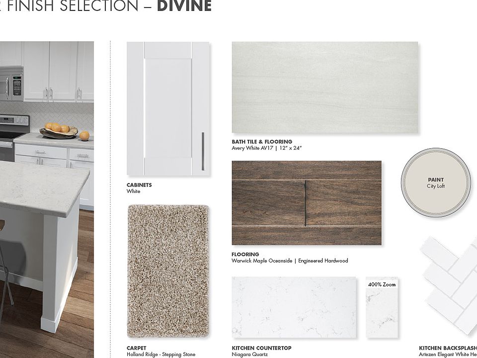 Start your day with a cup of coffee on the back balcony. Inside, the large kitchen island offers great prep or informal dining space. Linen cabinets with white quartz countertops, maple wood flooring with dark gray tweed carpet in our Divine package.
