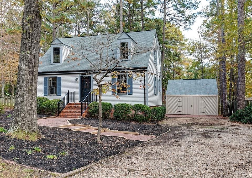 REDUCED $15,000. WOW! Wonderful Cape Cod style home for sale in West End minutes from Short Pump. Come see the 4 bedrooms and 2-1/2 baths recently updated with new cabinets, new granite counter tops, solid hardwood floors and fresh paint throughout. The first floor boasts an open dining room area, separate den with fireplace and an expansive family room area with a full wet bar. The kitchen has new stainless steel appliances, with french door fridge, new white shaker solid wood cabinets, "Colonial White" granite counters and large single bowl sink. The cozy bedroom on first floor overlooks a wooded area. Up the oak staircase is an updated bath with new vanity and granite top. The master bathroom conveniently lays out with shower and linen closet. Additional storage off the master bedroom can be utilized for storage or a personal dressing room. At the rear of the house you'll find a private deck area perfect for al fresco dining, and the rear fenced in yard is privately situated and is great for pets! The detached workshop is a great addition for any enthusiast or hobbyist. Come see this magnificent updated and well cared for Short Pump home today!