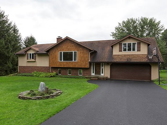 4 br Tri-level with modern floor plan and private 2.23 acre lot. Updated kitchen with quartz counters and stainless appliances, cathedral ceiling in LR with FP and hard wood floors. Bright light throughout the home. Private owners suite has separate dressing areas and walk-in closets. The large lower level family room has FP, wet bar, double walk out sliders to patio area, lg rec room, full bath, nice storage and laundry. Energy efficient,newer roof, thermo pane windows, and high efficiency wood burning FP insert. Convenient location close to town but great space for wildlife watching!