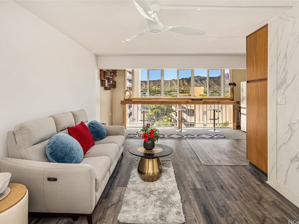 New listing! Enjoy the fresh island air and breathtaking views of Diamond Head from your open floor concept unit. Recent 2025 upgrades include an enclosed lanai with a full length counter that can serve as a work or dining space, new glass shower door, new refrigerator and stove. The bedroom was enlarged to accommodate a king size bed. In 2022, luxury vinyl plank flooring was installed and the kitchen and bathroom were renovated. The secured parking garage will lead you to your assigned, covered parking stall. Secured bldg. entrance. Close to beaches, Waikiki restaurants, shops, Kapiolani Park, Honolulu Zoo, schools and more. Amenities include guest parking, community laundry, surfboard and bike storage. The building is VA approved. Actual sq. footage doesn't match tax records due to enclosed lanai. Come and see this gem before it's gone!
