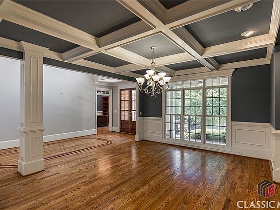 On the first floor you have a large formal dining room that is perfect for entertaining which opens to the living room with vaulted ceilings, built in book cases and a fireplace with Frye gas logs. The updated kitchen is a chef's dream with top of the line appliances, a large granite slab island and butlers pantry with a "Chick fil a" ice maker. The keeping room is off the kitchen and offers vaulted ceilings and a stacked stone wood burning fireplace which truly makes the kitchen the heart of the home. The owner's suite features hardwood floors, tray ceilings, an on-suite bath with a soaking tub and tile shower. The first floor also offers an office with vaulted ceilings and wood beams. The laundry room and half bath are conveniently located off the kitchen near the garage entry.