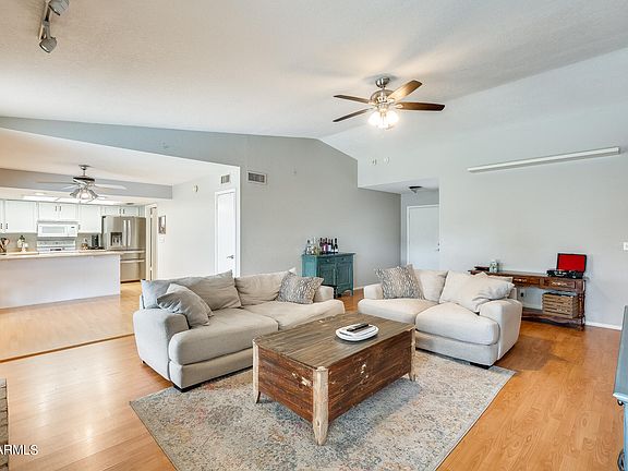 Amazing 3 bed, 2 bath Chandler home with a pool! Vaulted ceilings and wood-look laminate flooring create a spacious feel, complemented by large windows and a cozy fireplace. The primary suite features an ensuite bathroom with a granite dual vanity and tiled shower. Beat the AZ heat in your sparkling pool or relax on the covered patio. The backyard also features fresh grass ideal for pets & kids and an additional storage shed. The 2-car garage offers plenty of space for storage & a work space. Located in a quiet community with NO HOA with quick access to St Rt 101 and shopping, dining, & entertainment right at your fingertips!