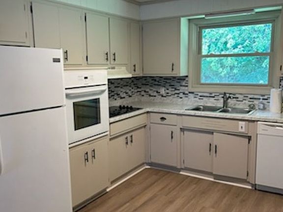 Refinished hardwood floorsFresh paintNice backsplashNew vinyl flooring