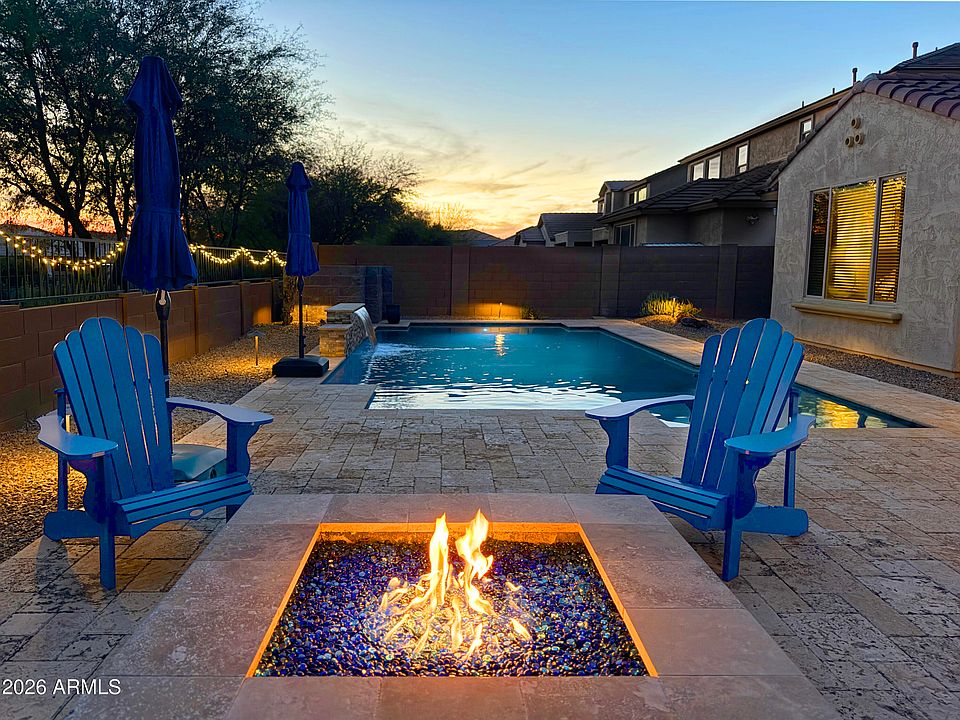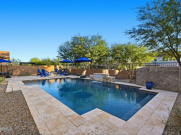 •Luxurious, yard w/ pool with split-face stone and sheer-descent water feature, natural gas firepit, easy-care landscape, partial view fence backs to a wash.