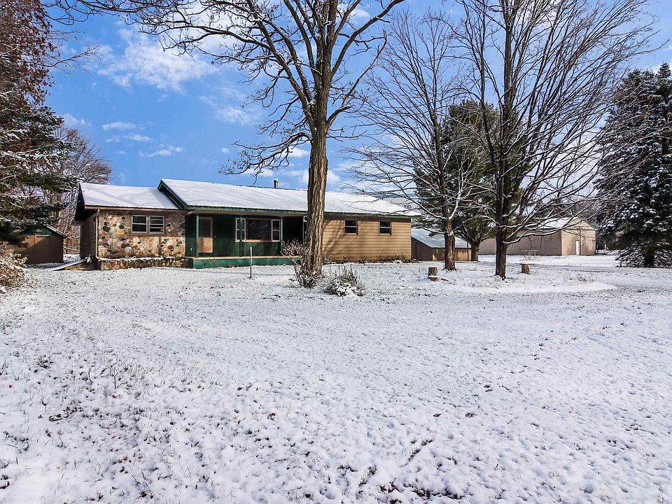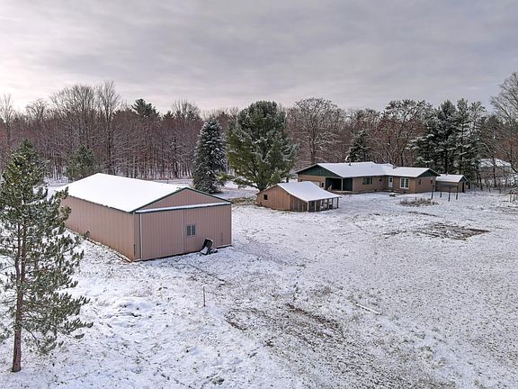 Acreage, multiple outbuildings, recently updated home and state land access just steps away, what more could you ask for. Expansive ranch style home that has been recently updated to include a new kitchen with hickory cabinetry, refinished hardwood flooring, updated laminate flooring and fresh interior paint. Floorplan offers two separate main floor living rooms, one with a cozy wood stove, main floor primary bedroom suite with private bath and walk-in closet, two spacious main level guest bedrooms, full guest bath, main floor laundry room with half bath and a full unfinished lower level. All situated on a private 10 acre setting with a 30' x 60' pole barn, second outbuilding and an attached two car garage. Property is just steps away from state land access and situated on a county maintained road for easy year round accessibility. Wonderful home, setting and location.