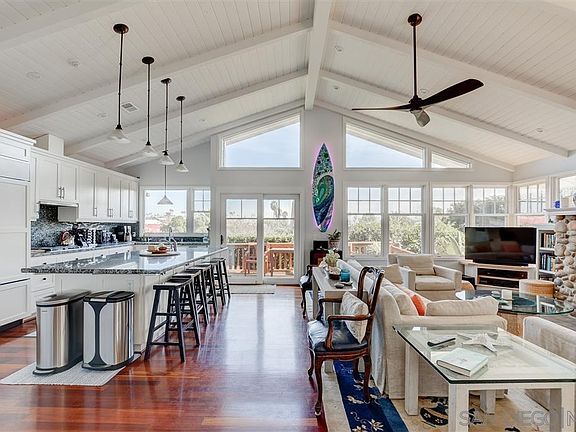 A RARE FIND, a beach house with privacy-amazing location at the northern end of Del Mar Beach Colony 2 blocks from the beach. Home designed for ultimate beach living inside and out. Decks, Great Room and outside Patio both w/Riverstone fireplaces. Gorgeous Brazilian Cherrywood floors throughout. Gourmet kitchen with stone countertops and large 4'x9' center island. High open beam ceilings with abundant natural light from windows in all directions. Close to Del Mar Race track & easy access to freeway.