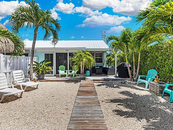 This charming 1/2 duplex concrete home is a coastal paradise that boasts an array of desirable features, making it the perfect place to call home or your vacation getaway! This home is also currently in the vacation rental program and makes for a great investment property. You are greeted with a gravel drive leading up to the property that boasts an easily accessible ground level entry. The house features a keyless entry system, adding a level of convenience and security to your everyday life. As an extra layer of protection, the house is also equipped with accordion shutters and panels. Step inside, and you're welcomed by well-appointed rooms, with tile floors throughout. The kitchen is fitted with stainless steel appliances and stunning Silestone countertops that extend a timeless appeal. The house follows a west-facing orientation, where you can enjoy breathtaking sunsets from your own backyard. It comes with a covered porch at the front, further embellished by a covered extended back porch that is partially screened, complete with a wood deck. There is a smoothly paved path leading to a cozy tiki in the backyard, with the property embraced in a 6ft high fence for privacy. The remodeled jack and jill bath offers functionality and style. Blinds are also included providing privacy and managing natural light. For outdoor enthusiasts, there's a little fire pit, an outdoor shower, and a dock with power and water -- this 30ft dock overlooks a 100ft wide canal. In addition, the covered outdoor living area is complemented by a grill and patio furniture for those fun barbecues with friends and family. The property features six grand palm trees, dotting the landscape, further reinforcing its tropical charm. Harnessing a blend of indoor comfort with an authentic Florida outdoor lifestyle, this property is indeed a haven of relaxation and tranquility. This is undoubtedly a home you don't want to miss!