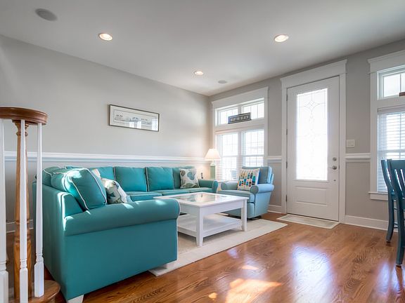 Excellent condition! Newly built custom home! This Upside - down style home has 4 gracious sized bedrooms two of which are en-suite with custom tiled showers and beautiful vanities having granite tops. In all three full bathrooms and a second floor powder room. Downstairs has a large family room with hardwood floors and a custom bar area. Three bedrooms and a laundry area. High-end trim work and custom closets. Upstairs the wide open floor plan with accustom designed kitchen having beautiful custom cabinetry stainless appliances, double ovens, a wine fridge and a pot filler in the backsplash. The large living area has hardwood floors and a gas fireplace with sliding glad doors leading to the big second floor deck. A huge master suite with its custom double vanity bath and a large tiled walk in shower and water closet. The exterior is maintenance free from top to bottom. The deck has a view of the bay! Plenty of off-street parking. This home is professionally decorated and fully furnished including electronics. A MUST SEE!