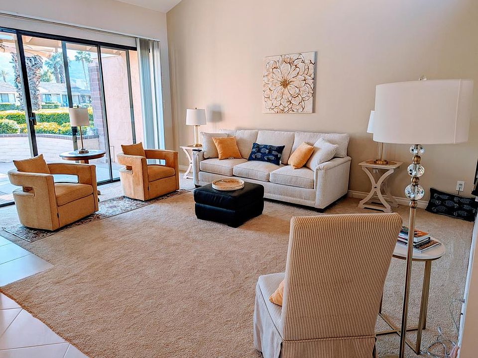 SOUTHERN Views. Best Location. Gorgeous, Remodeled Condo, popular End Unit. Sunny Location! From the Private Patio are views of the pretty Desert's Mountains. The patio is enjoyed overlooking Monterey Country Club Golf Course located between the Fourth and Fifth holes of the 'South Golf Course.' Choice of Two heated Swimming Pools just steps away. Home has 2 bedrooms plus additional Den/Media/Office room. Being a popular end unit, this '30 Max Plan' is remodeled with high end updates. Home shows with a Light, Fresh Feel. Home includes, New Stainless GE Kitchen Appliances, New LG Washer/Dryer, New Efficient Glass Windows and Blinds, New Kitchen Gold Faucets, New Plumbing drain lines, New Bathroom Faucets. Newly installed AC/Heater, New Carpet/Tile, New Drywall/ Texture, and New Recessed Lighting throughout home, plus 3 New Ceiling Fans. The Master BathRoom has New Walk-in Shower plus new Vanity Mirror. Has no atrium, remodeled with Cabinets for Office use. The Living Room Wall was opened up to hold a large size TV. The Fireplace surround in the Living Room was transformed with White tiles for a modern bright look. The Patio is equipped with Electric Patio Awnings. This Charming home in Monterey Country Club is close to the enjoyable McCallum Theatre, and to amazing shops on El Paseo Avenue to enjoy Fine Shopping and Dining experiences. Short Term rentals are allowed thru city permit.Hoa #1 -$735 #2 Fee $133