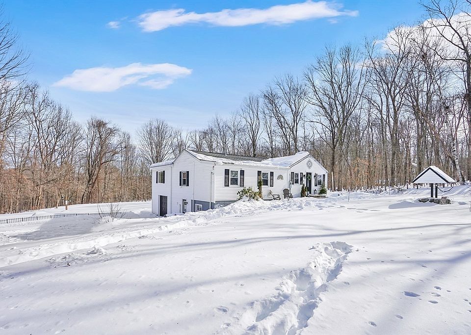 Your Exceptional, Renovated Ranch style home nestled on .80 acre lot, and if you are looking for backyard seclusion, privacy & space for outdoor entertainment - this is it! AND there's more... A phenomenal private, PRIMARY suite addition boasting SUNRISES & loads of natural light, hardwood floors, walk in closet, beautiful full bath- tiled shower & dual vanity w/ qtz ctops. Fabulous WHITE Renovated kitchen, ss appliances, bk splash, granite c tops opening to dining & living rm combo- featuring hdwd floors, wood stove & sliders overlooking backyard - SUNRISES to catch! Down the hall features two bedrooms w/ hardwood flrs, renovated full bath & LAUNDRY rm. COZY lower level offers a wonderful family rm/office space w/ electric fireplace & wine cooler to stay - A touchdown! Deck dining & sunrises combined = relaxation. Seller states upgrades incl: Hot water tank(2025), finished lower level w/ carpeting & fireplace (2024), central air a BONUS! Lots of parking space another added feature..