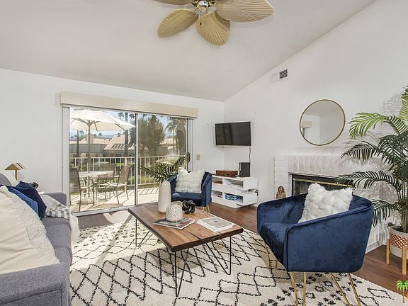 Welcome to Desert Falls Country Club! Desert living at its finest!! This wonderful community is a hidden gem, which allows short-term vacation rentals and is extremely popular for snowbird rentals!! This lovely 2 bedroom, 2 bath unit has been a successful vacation rental. This upstairs unit is offered turn-key, fully furnished, with new flooring and provides mesmerizing mountain views, as well as views of the sparkling pool. Perfect for a second home, short-term vacation rental, or the best of both worlds. DFCC offers several amenities, such as golf, tennis, pickle ball, bocce ball, pools/spas, fitness room, clubhouse, and much more. Conveniently located in Palm Desert not too far from El Paseo shopping and dining. Don't miss this opportunity!