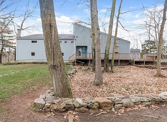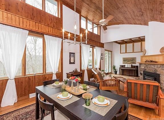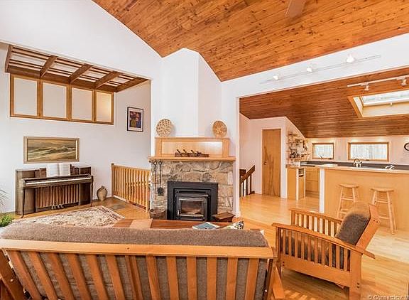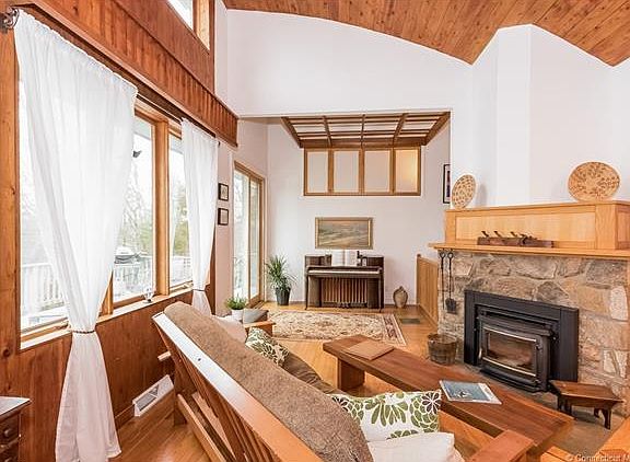 Magnificent lot abutting the Westwoods/state forest (39 miles of trails on 1,200 acres.) Located in a private community, this home offers privacy and tranquility yet is only minutes to Guilford center. Built in 1976 with a sensitivity to energy conservation, the south-west face of the building has abundant glass for passive solar gain which aids the Central Heat and has the correct orientation assists the Central AC system keeping things cool in the summer.The contemporary design has an open floor plan, HW floors and vaulted ceilings. The Great Room is a living area with fireplace, dining area, music nook and the big kitchen with Island. A half flight up is the Family Room and Office (with built-ins.) Also on the main level is the Master Suite with walk-in closet and full bath with soaking tub and separate shower. Off the entry foyer is the two car attached garage and the other 3 BRs. On the BR level is a hall bath, large laundry room and a utility room/workshop. The south bedroom has sliders to the yard. Options for apartment/inlaw suite with private entrance. There are front and back decks and great connection to the beauty of the setting. There are several out buildings including a 2 stall horse barn. The area is fenced for horses. Gardens and mature trees enhance the feeling of peace and tranquility. Just about one mile to the Historic Guilford Green, shopping, restaurants, transportation (I95 and the commuter train) and the Long Island Shore are very accessible.