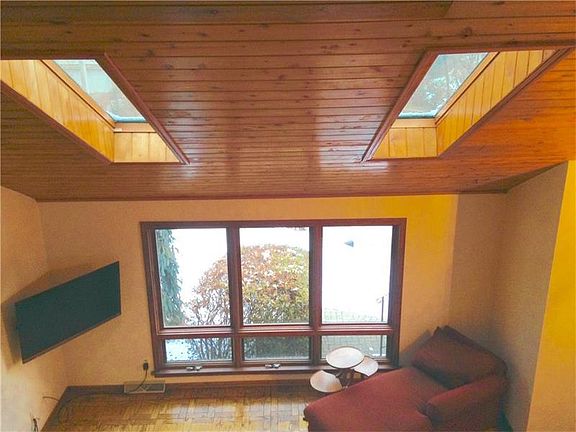 Unique custom contemporary imagine a Ski/Swiss chalet! nestled on private grounds and full of personality! *Living room / Great room with soaring vaulted 2 story ceiling & sundrenched by a window wall and 3 skylights a*Handsome brick fireplace*Spacious updated eat in fully equipped galley kitchen w/ pantry, wine rack & spacious dining area w/ doors to beautiful back patio*Balcony overlooking living room*Oversized master bath room complete w/ jet spray tub*Great closet space*Wonderful private deck off kitchen/dining area so perfect for entertaining or morning coffee*Option for 2 bedrooms on first floor OR bedroom suite OR bedroom & den/office*Perfectly convenient location to all Pittsburgh destinations including all Medical Centers, all Universities, the Cultural District, Shadyside, Google, shopping, restaurants and more!*Ambiance of peaceful quiet neighborhood