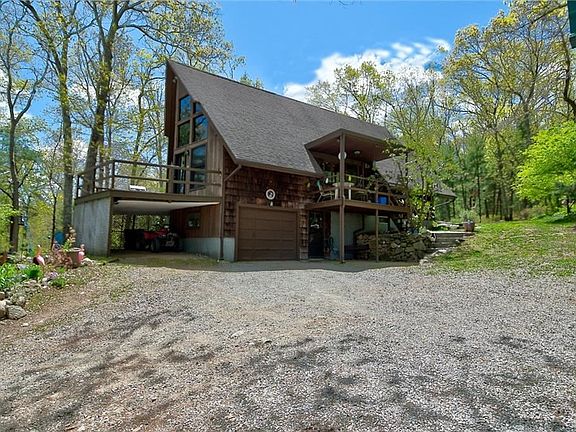 There is no place like home. Rarely does an opportunity present itself to own a One-of-a-Kind custom built Chalet style home. This home comes complete with three bedrooms, two and a half baths, featuring a spacious master bedroom with built-ins on the upper level. The main level includes a wonderful open living space and dining room with cathedral ceilings, ample natural light with a bluestone fireplace, and two additional bedrooms and bath. A huge deck with large paned-glass windows have beautiful views. The home also comes with a finished walkout lower level that has its own separate entrance which includes a wet bar. A one car integral garage is also a bonus. On the outside, the house opens to a spacious backyard with firepit to host family and friends for gatherings. Almost two acres of seclusion yet conveniently located to all amenities. Country living at its best!!!