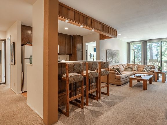 Corner south facing unit with 2 decks, one off bedroom and one off living area, overlooking open space and south views. Bedroom slider offers East views You will love sitting on the deck drinking coffee watching the sun come up on Mammoth Rock and the Sherwin's. You will want to experience this for yourself. The jacuzzi allows you to enjoy the sunset. The best of everything. Conveniently located at shuttle stop for EZ access to Canyon Lodge and The Village. Upgraded Woodburning stove with permits on file, opens up living area as fireplace has been removed. Cable and internet an additional $51 per month. Upgraded windows, additional ceiling lights in living, dining, kitchen, and both bedrooms. Upgraded kitchen counters, newer white appliances, ceiling fan in nook area, that can be sleeping area or additional dining area. Laminate floors in entry, kitchen and both baths. Lots of storage closets, ski locker included downstairs so skis and boards don't need to be carried upstairs. Some bike racks in garage area. One dedicated parking spot. One flight of stairs to unit or to exit to the outside open space. Washer/dryer in common area.