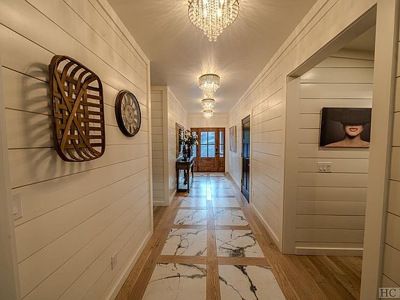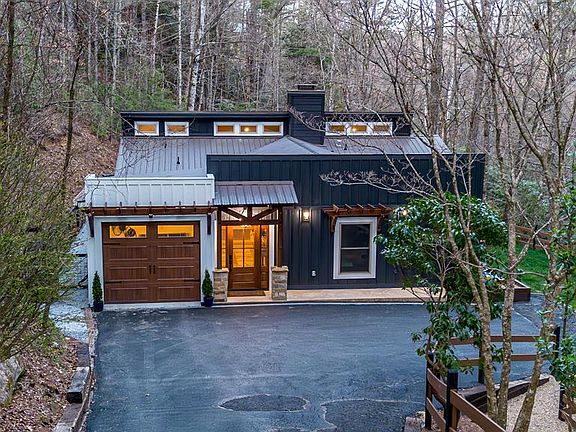 Upscale Mountain Modern home renovated from studs. The home features 3 ensuite bedrooms, Plus a detached guest house with full bath. Extensive use of shiplap and reclaimed wood. Main house has four separate decks. Entry hall leads to soaring ceilings in open floor plan, with hardwood flooring (except for baths and laundry being porcelain tile), an oversized one-car garage with electric vehicle charging station, a mudroom, powder room and laundry room with "smart" LG appliances topped with butcher-block, with sink and more storage. Primary bedroom off this entry hall has its own fireplace/sitting area, accent wall, kitchenette with compact refrigerator/freezer, walk-in closet, bath with underfloor heating, designer vanity, freestanding bowl tub, glassed-in shower and separate "throne" room with toilet/bidet combo. At rear of home, second and third ensuite bedrooms have custom closets, and glassed showers with designer vanities. Chef's kitchen has 56" Forno refrigerator/freezer, 48" Forno double-oven, 8-burner range (plus griddle), pot filler, and drawer convection/microwave. Custom high-end KraftMaid cabinetry with under-cabinet lighting and features expected in high-end homes, topped by waterfall quartz countertops. Wine wall features racks for 36 favorites plus a dual-control beverage cooler for more. Accent wall is finished with sink, coffee maker and pantry. Spacious dining room seats 8 or more. Open gathering room is anchored by gas-log stone fireplace. Stone walkways, gravel and fescue grass take you from deck to deck and down to the fire-pit seating area. Property mostly fenced. Natural light floods this home and dimmable lighting sets the ambiance. You must see this spectacular home to appreciate its finer details.