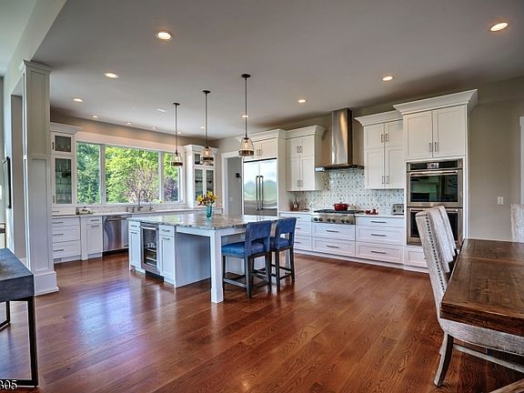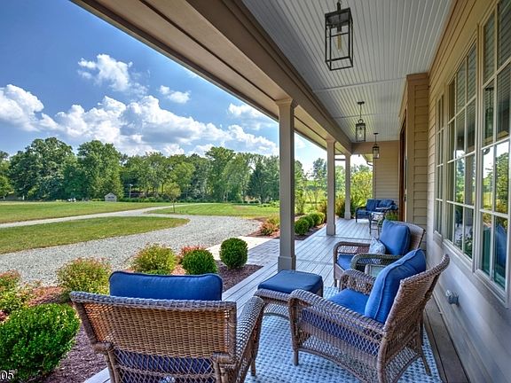 Freshly-Designed Custom Modern Farmhouse on Four+ Sweeping Acres Modern design elements and sublime countryside views define a custom modern farmhouse in Bedminster. This character-filled residence offers four bedrooms, five full baths and an attached three-car garage. Its impressive interior displays a fresh combination of urban sophistication and rustic elegance. Privately situated on 4.4 acres in Bedminster where it overlooks magical views of preserved farmland, the tranquil setting can be enjoyed from the roomy covered front porch or expansive rear bluestone terrace with a built-in fire pit as well as the well-appointed interior. This sheltered location is just minutes from Interstates 287 and 78 for commuters. A flowing 3,950 square-foot floor plan is enhanced by an additional 750 square-feet of artfully-finished space in the basement. Interior highlights include six-inch white oak hardwood floors, detailed trim and woodwork, two gas fireplaces, a wet bar, shiplap accents and large windows with UV protection framing bucolic views. Inside, sun-splashed gathering spaces are well-designed for entertaining and everyday living. A focal point in the living room is a floor-to-ceiling gas fireplace with a leathered granite surround set into a detailed wood wall. The dramatic arched window wall captures stunning views of the backyard. In the family room, another gas fireplace surrounded by leathered granite and stonework and a built-in wet bar create an ideal backdrop for entertaining. Just off the family room is a powder room with shower, entry to the garage and a door to the backyard. The chef's kitchen is designed with white Shaker-style cabinets, an oversized center island topped in leathered granite, and quartz countertops edged by a glass and stone backsplash. Stainless steel appliances from Jenn Air such as double wall ovens, a six-burner gas cooktop capped by a hood, microwave drawer in the island and beverage refrigerator are gourmet touches. Nearby, a stylish laundry room contains built-in cabinetry, leathered granite counters, pantry and storage closets, stone tile flooring and a door to the front. Single-level living is an option with the graceful first-floor master suite consisting of a bedroom filled with natural light from floor-to-ceiling windows overlooking sublime panoramas of the acreage. Pocket doors enclose a room-sized and windowed walk-in closet with customized built-ins and an elegant master bath. Spa details include two stone-topped sink vanities, a roomy walk-in shower featuring floor-to-ceiling tilework and dual shower heads, plus a private water closet enclosed by a custom pocket door of wood and antique glass. The guest bedroom suite situated over the first-floor master bedroom offers a walk-in closet, access to a huge attic and a generously-sized private full bath with an extra-large walk-in shower. A rear staircase leads to two more bedrooms and two full, updated baths. All of the bedrooms have gorgeous pastoral views of the scenic Hunt Country property. The windowed basement contains a huge designer living area with shiplap walls and ceiling, built-in shelving and barn doors; it is currently used as an office suite. This inspirational home is served by natural gas, four zones of heat and air conditioning, public water, two hot water heaters and a four-bedroom septic. Located in Somerset County's picturesque Bedminster Township just outside the quaint village of Pottersville, this residence is close to Hamilton Farm Golf Club, Bamboo Brook Outdoor Education Center, Midtown Direct trains stations in neighboring Peapack and Gladstone, and a variety of exceptional public and private schools.