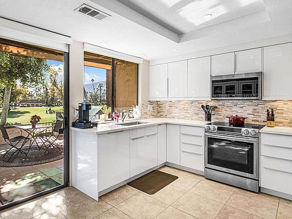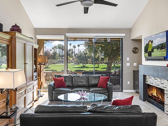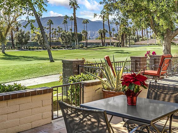 Imagine waking up every morning to the panoramic views of the south-facing fairway and mountains from your beautifully renovated 2-bedroom, 2-bathroom 200 plan. As you enter through your landscaped private courtyard, you'll be greeted with an open floor plan featuring a spacious great room with cathedral ceilings and clerestory windows, flooding the space with natural light. The sleek modern kitchen boasts newer European-style cabinets, quartz countertops, recessed lighting, a wine cooler, and stainless steel appliances. The primary suite overlooks an enclosed atrium, bringing in an abundance of light and fresh air. The remodeled ensuite bathroom includes a large soaking tub, a separate shower, and floating cabinets with dual vanities. The pet-friendly patio, enclosed with a short wall, has two motorized awnings for added shade and is the perfect spot for enjoying those gorgeous sunrises and sunsets. The HVAC system was replaced in 2021. Monterey Country Club is close to El Paseo for all the best shopping and dining. It offers 27 holes of championship golf, bocce ball courts, 19 tennis courts, including pickleball, and 37 community pools and spas. The HOA maintains the exteriors and roofs, and HOA fees include internet and cable TV. This is the perfect place to call home, where you can indulge in the beauty of nature and enjoy the carefree desert lifestyle.