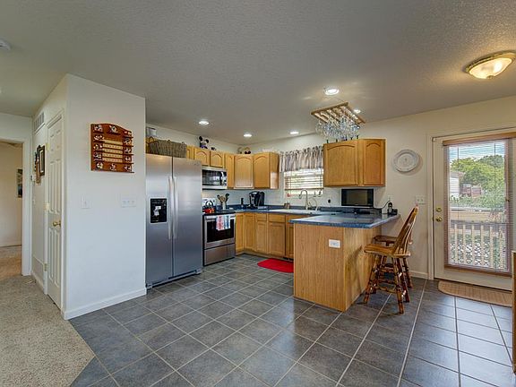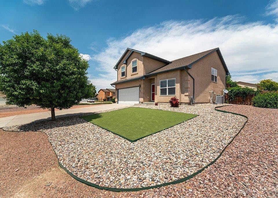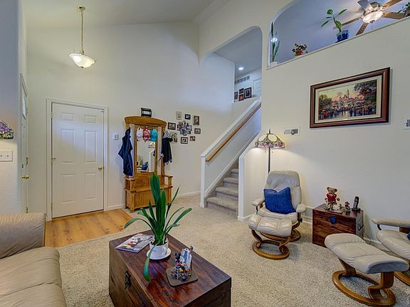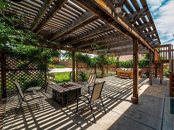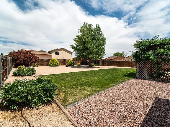 Great house for the money and in great condition. Wonderful yard with everything done! Pergola over huge 25 x 19 foot back patio, plus upper level open deck, wood privacy fence in back yard, rocks, grass, trees, shrubs and more, all on sprinkler or drip irrigation. Glass storm door leads to the main level living room. Soaring ceiling opens up the dining area that overlooks the living room. It is part of a wide open tiled kitchen, with windows, pantry, drinking water filter, plenty of cabinets, mounted TV that stays and all the appliances that are about or less than a year old, including convection oven, of matching stainless steel. Generous master suite on the same level with a walk-in closet and full bath, including double sinks. Up a few steps is the full bath next to the two nice-sized guest bedrooms. On the garden level, find a very welcoming family room with ceiling fan, recessed wall for large screen TV (mount will stay), attractive laminate flooring and a cool tucked away feeling for relaxing. Plus a tiled hobby room. You will find ceiling fans throughout the house, blackout shades in the bedrooms, security lights all around the house, drive-in gate off Coral into back yard, bay window in living room, all on a large corner lot with mountain views. You will love the privacy and peacefulness of the back patio and yard behind the house...there is 220 there for a hot tub if you like. Pergola is gorgeous with trumpet vines covering it in cool green cover.