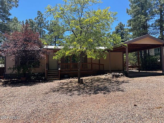 Charming, light and bright 3 Bedroom 2 bath w Arizona room and workshop is NOW MOVE IN READY! Brand New ROOF w/warranty, Fresh interior PAINT t/out, new CARPET in bedrooms and Arizona room, and New Gas Hot Water Heater. The home is on a large .245 acre lot w/ lots of tall Ponderosa Pines centrally located in Show Low on a quiet dead end street. Featuring a circle drive and carport, a welcoming front covered porch, great room floor plan w/ separate dining area, vaulted ceilings, and ceiling fans t/out. Living Room has laminate flooring and beautiful picture windows that let in natural light. Kitchen has a skylight, gas range, refrigerator, dishwasher, disposal, and breakfast bar The primary suite has a walk-in closet, dual sinks, and step-in shower and private entrance through the bathroom to the laundry room. Large laundry/mud room has its own sink, extra storage, a doggie door, and leads to a covered side deck. Two other bedrooms are split from primary. The light & bright Arizona Room has a skylight, 2 sliding glass doors and 2 large windows, has baseboard heating and 2 covered decks on both sides. Fully fenced backyard has 12+ Ponderosa Pines, a tulip garden, a detached Workshop (10X15), firepit, and a bird flight that can be used for a chicken coop or bunny hatch. Spring flowers bloom along the circular drive (Iris, Crocus, and Tulips) and the front yard has a variety of mature trees (sour cherry, golden delicious apple, crab apple, and plum). Prewired for a generator. Property is also wheelchair accessible. NO HOA! Don't wait!